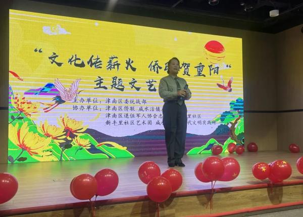 岁岁重阳,今又重阳。为弘扬中华民族尊老敬老的传统美德,丰富侨胞及居民的精神文化生活,10月29日上午,津南区委统战部在咸水沽镇新时代文明实践所举办了“文化传薪火 侨胞贺重阳”主题文艺汇演活动。区委统战部、区侨联、咸水沽镇相关负责同志,归侨侨眷代表人士、社区党员群众近50余人参加。