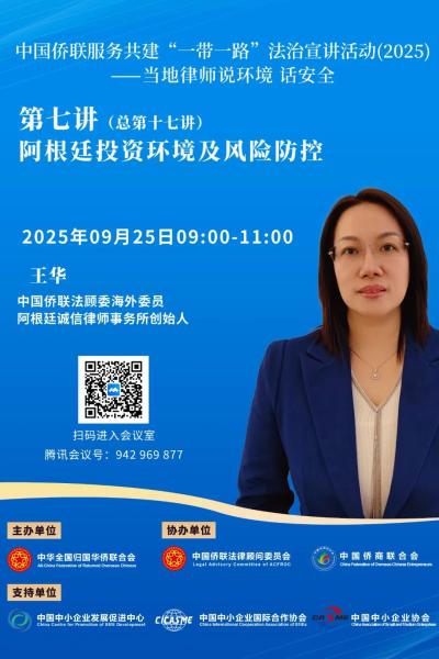 由中国侨联主办,中国侨联法顾委、中国侨商会协办,中国中小企业发展促进中心、中国中小企业国际合作协会、中国中小企业协会支持的“中国侨联服务共建‘一带一路’——当地律师说环境 话安全”法治宣讲活动2024年3月15日首次启动,至今,来自哈萨克斯坦、西班牙、马来西亚、南非、新加坡、新西兰、泰国、俄罗斯、墨西哥、韩国、印度尼西亚、德国、吉尔吉斯斯坦、蒙古国、澳大利亚、柬埔寨的中国侨联法顾委海外委员对所在国投资环境、风险防范要点及典型案例等进行了16期宣讲。2025年9月25日将进行第17期宣讲。宣讲链接如下: 第一讲至第十讲回放链接: http://www.chinaql.org/GB/419631/419659/460014/index.html 第十一讲中国侨联法顾委海外委员印度尼西亚张泳渊律师主讲《印度尼西亚投资环境分析》回放链接: https://meeting.tencent.com/crm/NxPDOBWP5a 第十二讲第十二讲中国侨联法顾委海外委员德国张志远律师主讲《投资德国法律实务》回放链接: https://meeting.tencent.com/crm/2YXb6MjR07 第十三讲 中国侨联法顾委海外委员吉尔吉斯斯坦田辉律师主讲《中亚国家的投资机遇与法律实务——以吉尔吉斯斯坦、乌兹别克斯坦为例》回放链接: https://meeting.tevncent.com/crm/24LdjWdme5 第十四讲第十四讲中国侨联法顾委海外委员蒙古国赵朝新律师主讲《蒙古国投资环境及风险防控》回放链接: https://meeting.tencent.com/crm/2965MBzq92 第十五讲 中国侨联法顾委海外委员澳大利亚蔡庆伟律师主讲《走进澳大利亚:投资环境与风范管理》回放链接: https://meeting.tencent.com/crm/Noq6dLk5ad 第十六讲 中国侨联法顾委海外委员柬埔寨黄智贤律师主讲《柬埔寨法律法规体系与投资环境》回放链接: https://meeting.tencent.com/crm/l7qMYjME8d 今年第七讲(总第十七讲)将于2025年9月25日(周四)9:00开播,由中国侨联法顾委海外委员阿根廷王华律师主讲。王律师毕业于阿根廷美洲大学,获得国际贸易硕士学位,持有律师执照和阿根廷国家公认中西文翻译资格证。王律师专注于公司法、海关法、国际贸易和移民法等,近年来在中资企业投标、重组、并购、索赔、公证等方面提供全方位法律服务,助力中资企业“走出去”。王律师还同时兼任阿根廷华侨华人妇女联合总会会长、中国驻阿根廷大使馆领事部法律顾问、阿根廷布宜诺斯艾利斯大学法学院特聘教授等职务。今年第七讲(总第十七讲)收看链接参见下方海报,敬请关注! ![]() |
