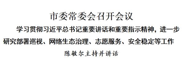 12月1日,市委常委会召开会议,学习贯彻11月28日中央政治局会议精神和习近平总书记在中央政治局第二十三次集体学习时的重要讲话、致中国志愿服务联合会第三届会员代表大会贺信精神,学习贯彻国务院安委会部署开展高层建筑重大火灾风险隐患排查整治行动通知要求,听取全市安全生产工作情况汇报,研究部署有关工作。市委书记陈敏尔主持会议并讲话。