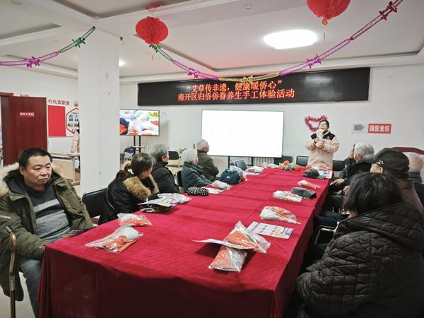 12月24日,南开区侨联携手学府街道办事处、天大四季村社区“侨胞之家”、南大西南一社区“侨胞之家”及龙兴里社区“侨胞之家”,共同举办“艾香传非遗,健康暖侨心”南开区归侨侨眷养生手工体验活动。近三十位社区侨胞相聚于天大四季村社区,亲手制作艾草养生锤与艾草护颈枕,在手工体验中领略非物质文化遗产的深厚底蕴,感受中华传统养生文化的独特魅力。