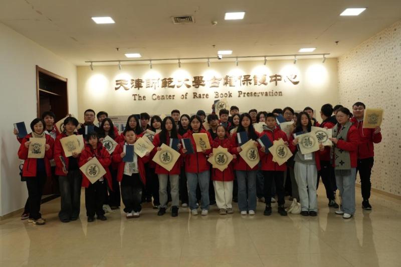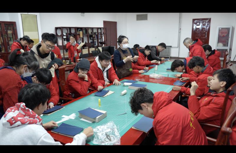 营员们来到员们来到天津师范大学古籍保护研究院。在专家的指导下,大家饶有兴致地体验了古籍装订与非遗拓印“福”字技艺。从穿针引线到固定书页,从上墨到捶打,营员们全神贯注,在指尖的方寸之间,亲身感受中华古籍装订技艺的精湛与非遗文化的独特韵味。营员马乐乐表示:“以前我只能在博物馆的玻璃柜外远远地看那些古籍,觉得离我很遥远。今天亲身体验了古籍装订过程,才发现里面的学问这么大。特别是拓印‘福’字的时候,闻着墨香,我感觉自己不仅是在学习一项技能,更是在和祖辈的历史对话,这种感觉很奇妙,让我对中国文化更加着迷了。”