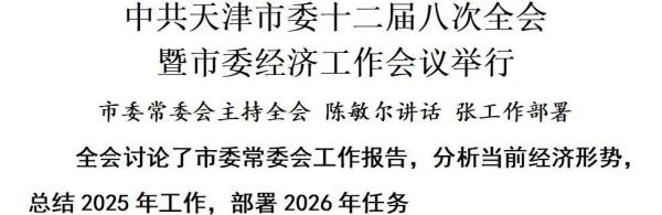 ![]() ![]() 中国共产党天津市第十二届委员会第八次全体会议决议 (2025年12月29日中国共产党天津市第十二届委员会第八次全体会议通过) 中国共产党天津市第十二届委员会第八次全体会议,于2025年12月29日召开。 出席这次全会的有,市委委员72名,市委候补委员11名。市纪律检查委员会常务委员会委员和有关方面负责同志列席会议。我市党的二十大代表和市第十二次党代会代表中的部分基层同志列席会议。 全会由市委常委会主持。全会讨论了《中共天津市委常委会工作报告》和《中共天津市委落实全面从严治党主体责任抓党建工作情况报告》。市委书记陈敏尔代表市委常委会向全会报告工作并讲话,市委副书记、市长张工对2026年经济工作作部署讲话。 ![]() 全会一致认为,习近平总书记在中央经济工作会议上的重要讲话,全面总结今年经济工作,深入分析当前经济形势,系统部署明年经济工作,具有很强的政治性、思想性、指导性。要认真学习领会,切实把思想和行动统一到中央经济工作会议精神上来,深刻领会把握当前经济形势和做好新形势下经济工作的规律性认识,深刻领会把握党中央关于明年经济工作的总体要求、政策取向、重点任务和关于加强党对经济工作全面领导的重要要求,进一步增强深刻领悟“两个确立”的决定性意义、坚决做到“两个维护”的政治自觉思想自觉行动自觉。 全会充分肯定市委常委会2025年工作。一年来的工作很不平凡,成绩来之不易,值得倍加珍惜。在以习近平同志为核心的党中央坚强领导下,市委常委会全面贯彻党的二十大和二十届历次全会精神,坚持以学习贯彻习近平总书记视察天津重要讲话精神和对天津工作一系列重要指示要求为工作主线,全面落实党中央重大决策部署,带领全市上下感恩奋进、负重前行,坚持走内涵式发展路子,大力实施高质量发展“十项行动”,统筹推进科技创新、产业焕新、城市更新,有效盘活存量、做优增量、提升质量,着力保障和改善民生,更好统筹发展和安全,纵深推进全面从严治党,扎实开展深入贯彻中央八项规定精神学习教育,积极做好中央巡视等配合和有关反馈意见整改落实工作,圆满完成上海合作组织天津峰会筹备和服务保障任务,扎实完成全年经济社会发展目标任务,千方百计盘活存量和防范化解风险,科学谋划“十五五”规划,“十四五”即将顺利收官,全面建设社会主义现代化大都市迈出新的坚实步伐。这些成绩的取得,根本在于以习近平同志为核心的党中央领航掌舵,在于习近平新时代中国特色社会主义思想科学指引,离不开中央和国家机关各部门的大力支持,是全市广大党员干部群众齐心协力、共同奋斗的结果。要深刻认识习近平总书记、党中央的关心关怀是做好天津工作的最大动力,因地制宜、抓准抓实是有效落实习近平总书记重要要求、党中央决策部署的科学方法,真抓实干、攻坚克难是推动天津高质量发展的关键所在,善作善成、见行见效是检验工作实绩的重要标尺,担当作为、拼搏进取是党员干部干事创业的应尽之责。 ![]() 全会指出,2026年是我市“十五五”开局起步之年,是各项整改任务落地见效之年,是攻坚克难关键之年。做好明年工作,总体要求是:以习近平新时代中国特色社会主义思想为指导,深入贯彻党的二十大和二十届历次全会精神,认真贯彻中央经济工作会议精神,全面落实习近平总书记视察天津重要讲话精神和对天津工作一系列重要指示要求,聚焦经济建设这一中心工作和高质量发展这一首要任务,完整准确全面贯彻新发展理念,积极服务和融入构建新发展格局,坚持稳中求进工作总基调,更好统筹发展和安全,以推进京津冀协同发展为战略牵引,扎实实施高质量发展“十项行动”,深入推进科技创新、产业焕新、城市更新,深化盘活存量、做优增量、提升质量,因地制宜发展新质生产力,充分激发有效需求,持续防范化解重点领域风险,着力稳就业、稳企业、稳市场、稳预期,推动经济实现质的有效提升和量的合理增长,不断提高人民生活水平,保持社会和谐稳定,实现“十五五”良好开局。 全会强调,要坚持目标导向、聚力开局起步,坚持问题导向、着力攻坚克难,坚持结果导向、努力提质增效,持续提高发展含“新”量、含“科”量、含“金”量、含“绿”量。 全会强调,要在聚焦区域一体化和京津同城化、推动京津冀协同发展走深走实上下功夫见实效。深度融入现代化首都都市圈,充分用好北京(京津冀)国际科技创新中心建设扩围机遇,推动“六链五群”扩容升级,统筹推进交通、生态环境、文化和旅游、公共服务等重点领域合作。 全会强调,要在以科技创新引领新质生产力发展、加快建设现代化产业体系上下功夫见实效。巩固壮大先进制造业,大力发展绿色石化、汽车、高端装备、新一代信息技术、新能源新材料、生命健康、循环经济等重点产业,加快发展金融服务、科技服务、设计服务、信息服务、现代运输与航运服务、商贸商务服务等生产性服务业,繁荣发展文旅、养老、体育等生活性服务业,做精做特现代都市型农业。强化企业创新主体地位,持续做好对大院大所的服务保障工作,加强应用创新研究,用好天开高教科创园等科创园区载体资源,把更多的科技成果转化到企业里去、转化为现实生产力。 全会强调,要在促消费扩投资、充分激发有效